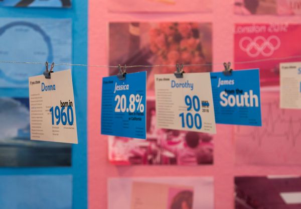 "Names as Labels" displays hanging pieces that act as a game. On one side, you choose a name that you believe would be more likely or less likely to have certain characteristics. The back explains statistical data linked with a specific name, explaining why a person would assume that name to have that characteristic. The two sides point out biases that exist and the information that causes people to be biased. Being aware of these biases that we subconsciously form hopefully can educate the public to actively try to be less biased.