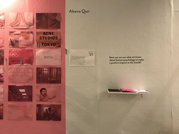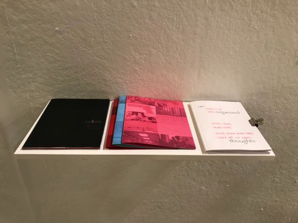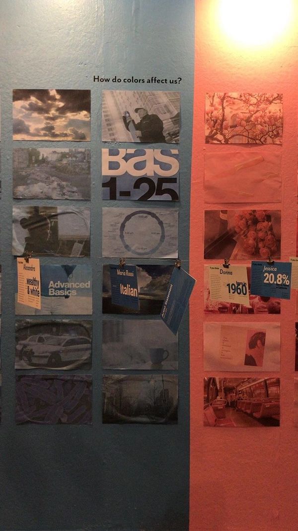 The posters on the walls represent different scenes overlaid with certain colors. These colors evoke specific feelings, making an environment seem more hostile, calm, safe, and more. The corresponding books for each color detail the mental and physiological effects that those colors can have on humans. Whether these associations that we have with colors and certain emotions and feelings are created by society or inherent, we must be aware that they exist.