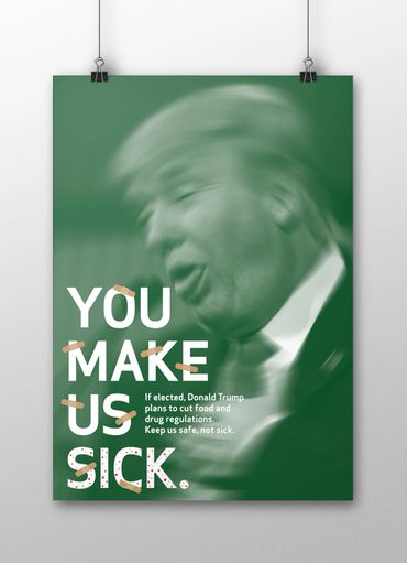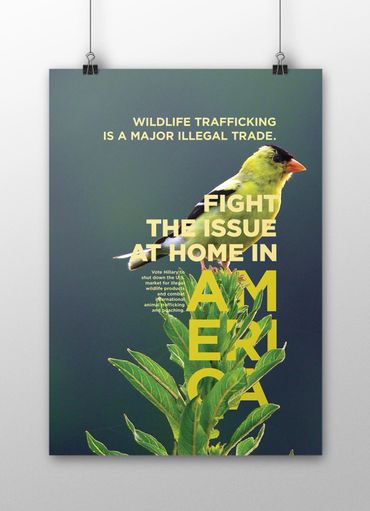 For a project preceding the 2016 Presidential Election, I created one poster in support of each candidate, and one poster opposing each candidate based on another student's poster. I chose to design my Pro-Hillary poster about wildlife trafficking, and my anti-Hillary poster took elements from a peer's poster—the image of Hillary, and the words "Lawyer and Politician"—and used those words and images against her. My anti-Trump poster was inspired by a peer's poster that stated that, if elected, Trump would not cut social security. I instead created a poster about Trump's plans to cut funding for the Food and Drug Administration.